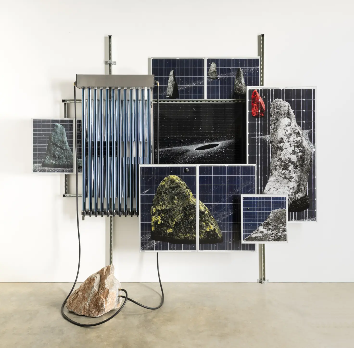 His recent work for Dartmoor: A Radical Landscape integrates solar technology into sculptures inspired by ancient standing stones. These works operate as energy feedback loops – solar panels power lights, which heat the sculptures, triggering fans to cool them down. This speculative reimagining treats sculpture as a living, responsive system, revealing the latent animism in the objects that surround us.